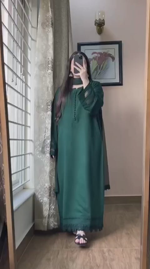 your style with this elegant 3-piece ensemble. The Premium dress, offering a perfect blend of sophistication and comfort. Paired with a Smart- Shalwar, this set ensures a flattering and sleek silhouette. The Dupatta adds a touch of grace and elegance, completing the look with delicate lace accents.