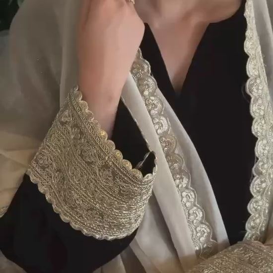 This exquisite micro velvet outfit in royal features a unique cut-out neckline design, elegantly adorned with a heavy crystal neckline bunch for a touch of opulence. The sleeves are detailed with crystal lace, adding a refined sparkle. The stylish chalk is enhanced with tassels on both sides, creating a graceful finish. This piece is the perfect attire for any occasion, blending luxury with contemporary design.